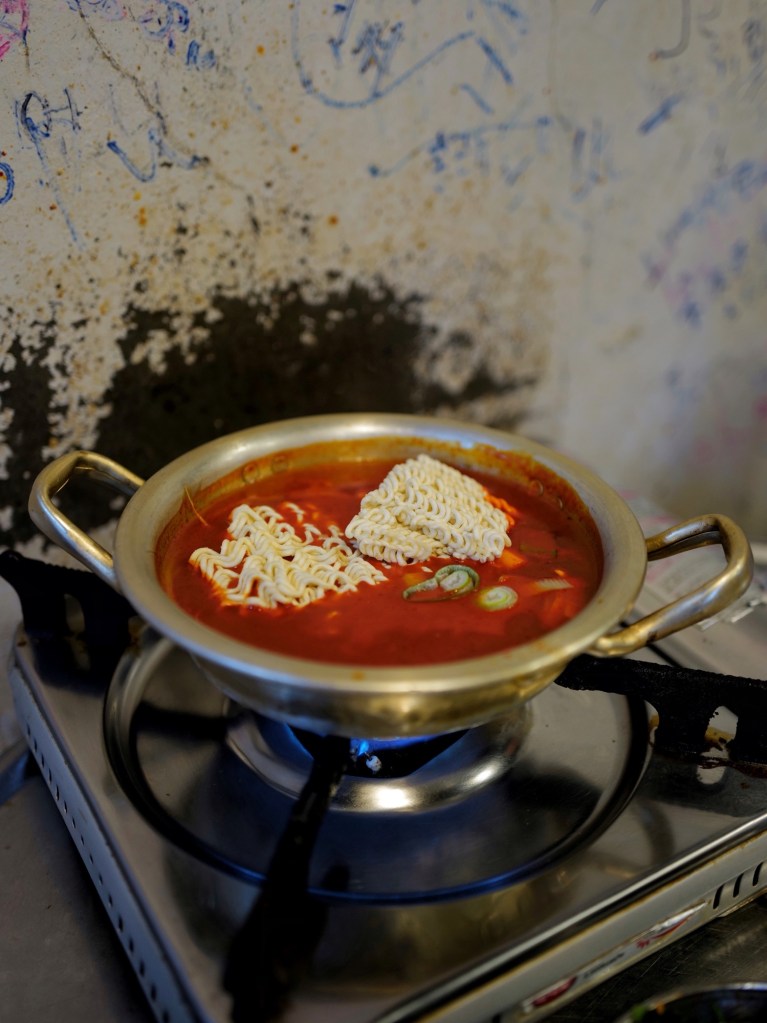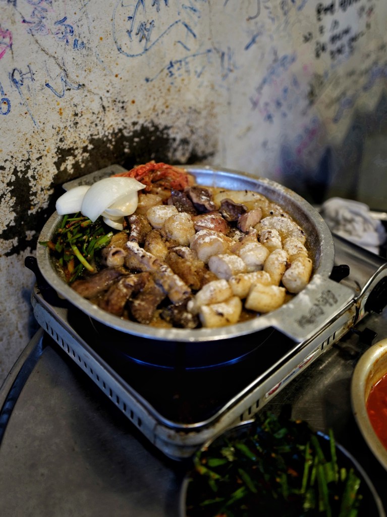 點了兩人份的綜合烤腸(牛小腸/牛大腸/牛心/年糕/馬鈴薯),附一碗泡麵,牛腸確實油香好吃,牛油烤出來的年糕、馬鈴薯和韭菜泡菜也超級棒!吃得下的話可以加點炒飯,不過我們已經膩到投降只好果斷放棄