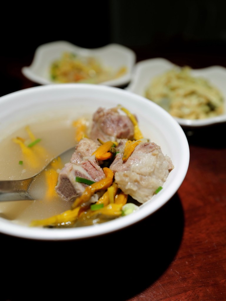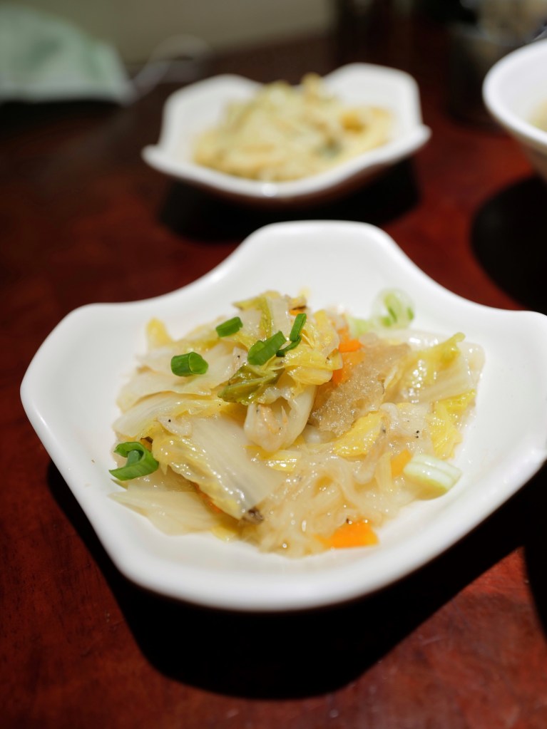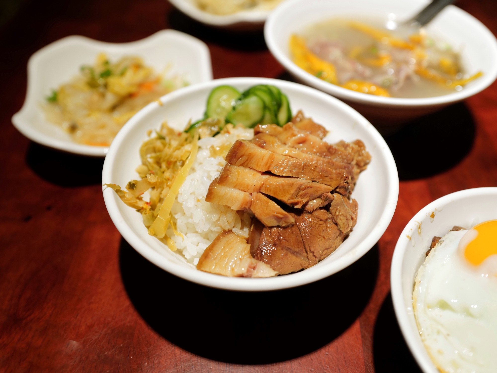 小小的店裡桌數不多,裝潢以傳統小吃店而言算現代化且乾淨;兩個人點腿庫飯、小碗魯肉飯各一加上數樣小菜和一碗湯,所有餐點的味道都比想像中更精緻規矩、更不油膩,要是有魯肉飯教科書可能就是這個味道
