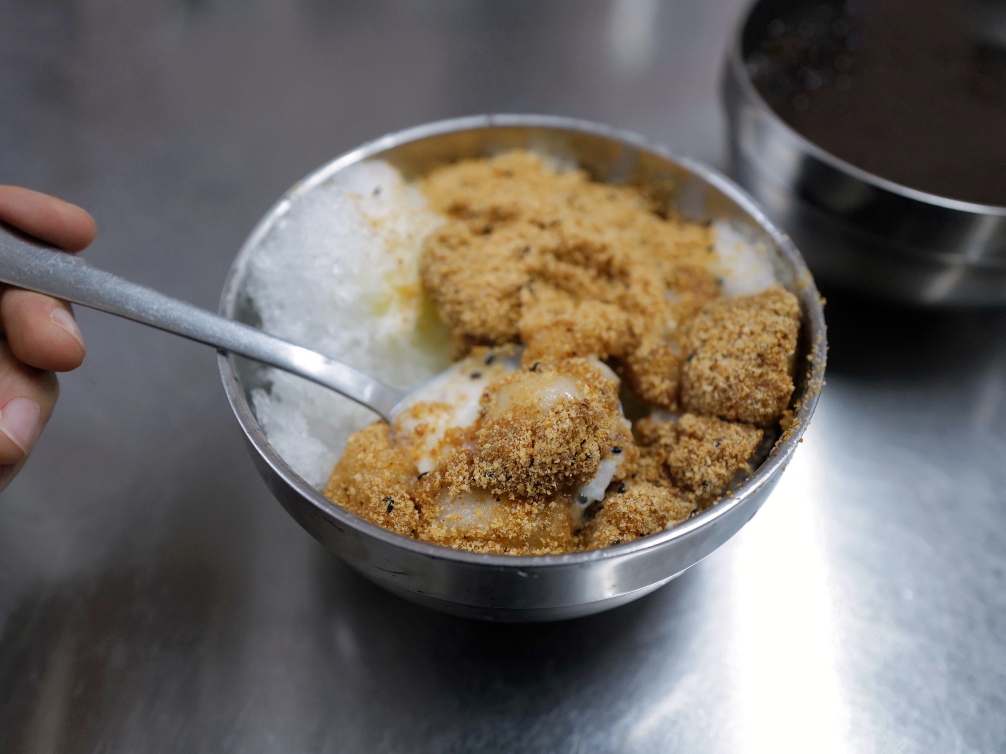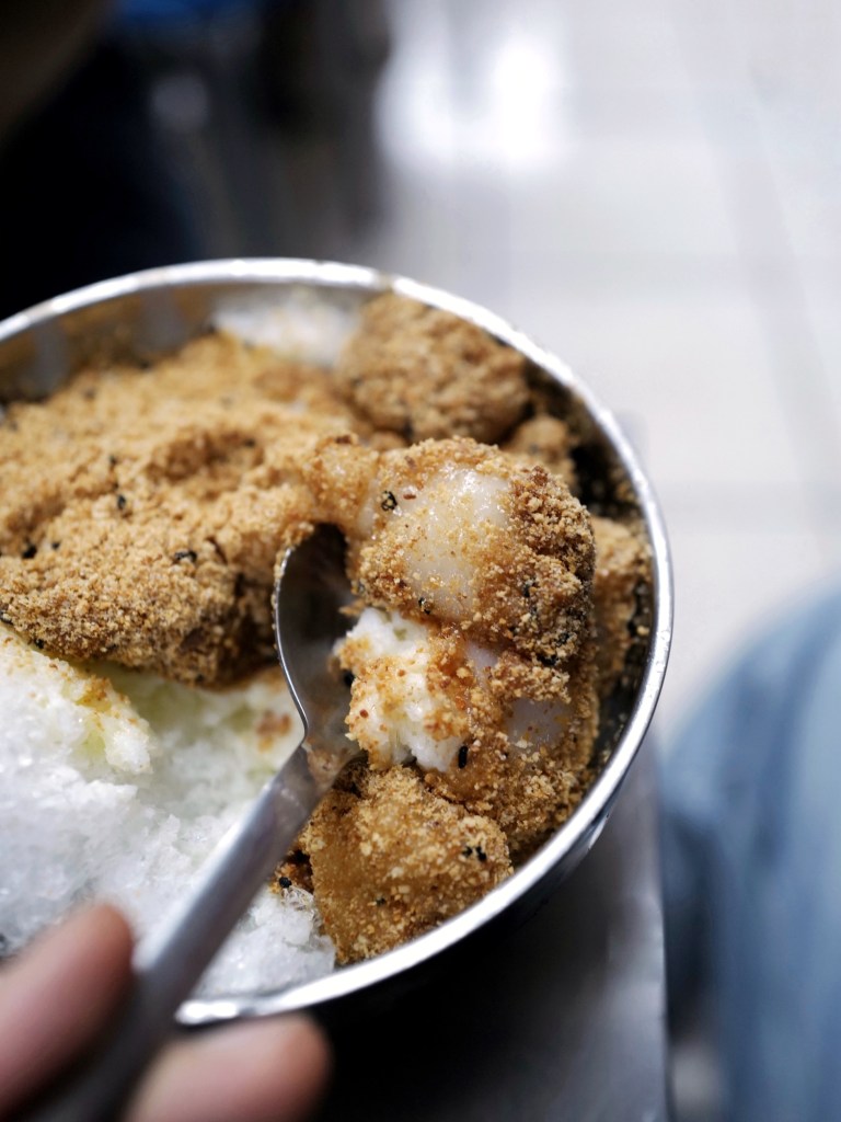 最想吃的麻糬冰是剉冰放上小麻糬,再灑大量花生糖粉和煉乳,所有食材剛好都是我喜歡的,也覺得這樣的搭配非常合拍,不太精緻但作為日常甜點很不錯;熱紅豆湯香氣夠,紅豆不算多但與價錢相符,甜度偏高
