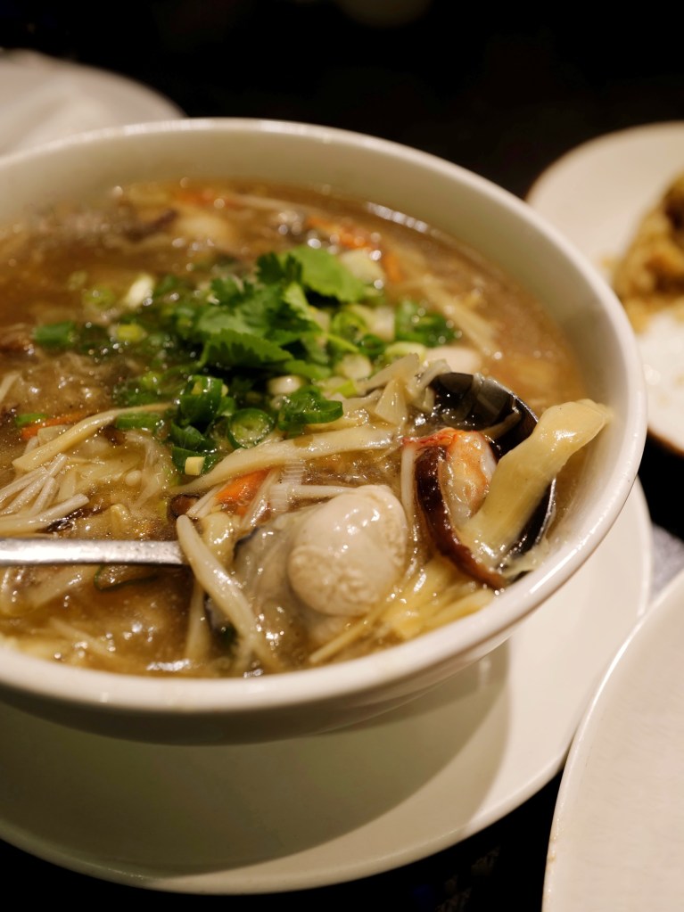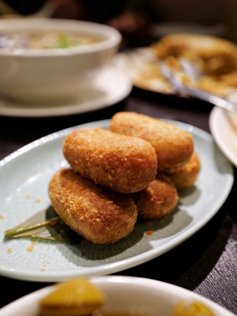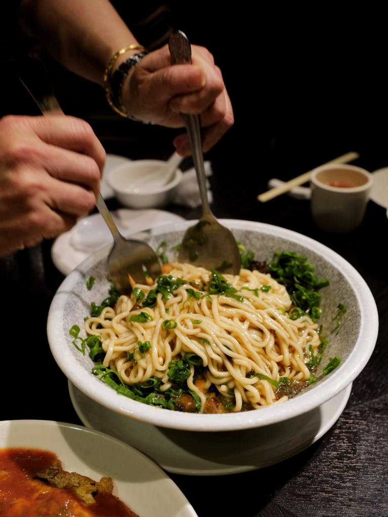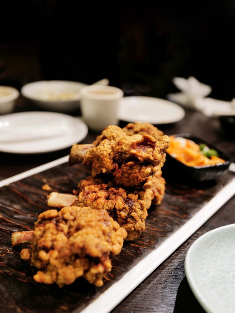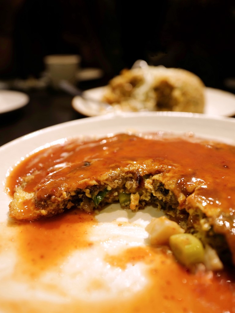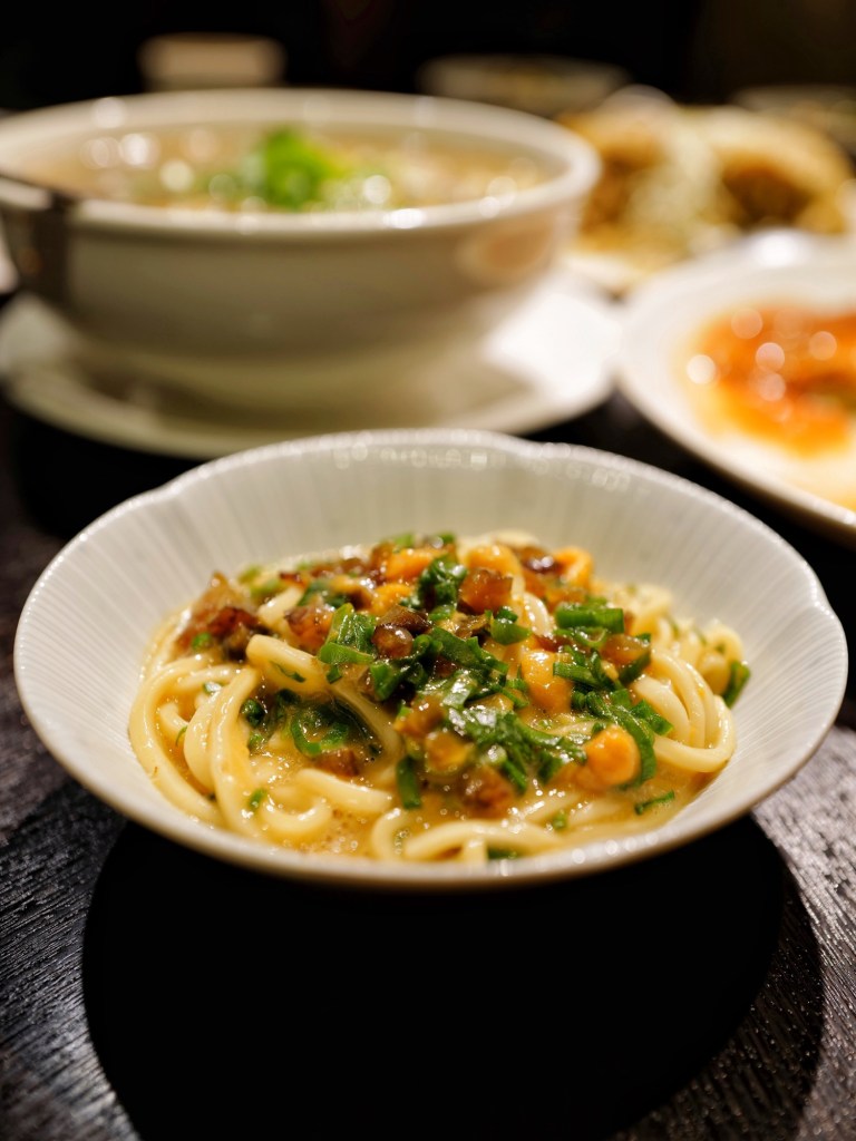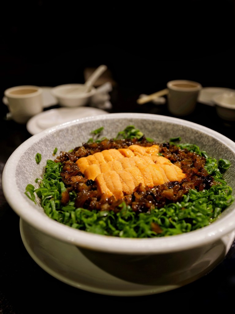五個人吃了八道鹹食加一份甜點,每一道都在水準之上,很喜歡烏魚子炒飯比例剛好、干貝蚵煎用料豐富、芋條外脆內Q,以及經典排骨酥香酥不膩,事先預訂的蔥燒煨蔘海膽麵味道也好,但口味比外型樸實許多