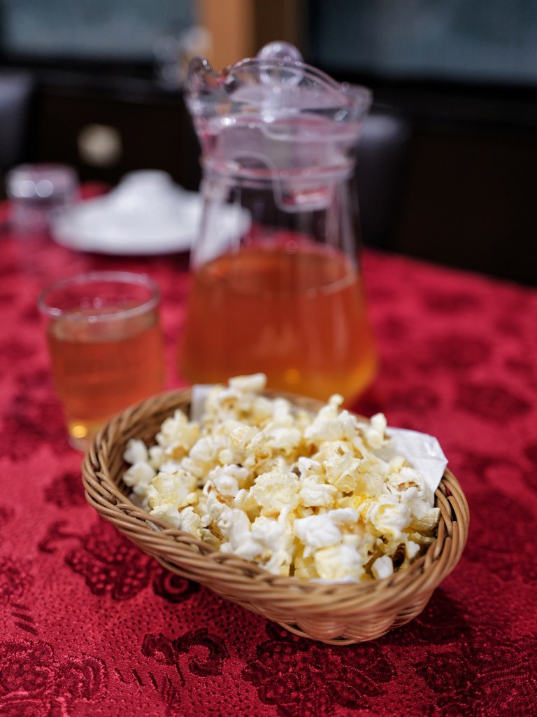 隨餐附常溫麥茶和鹹爆米花