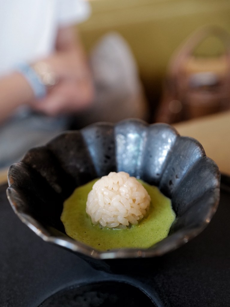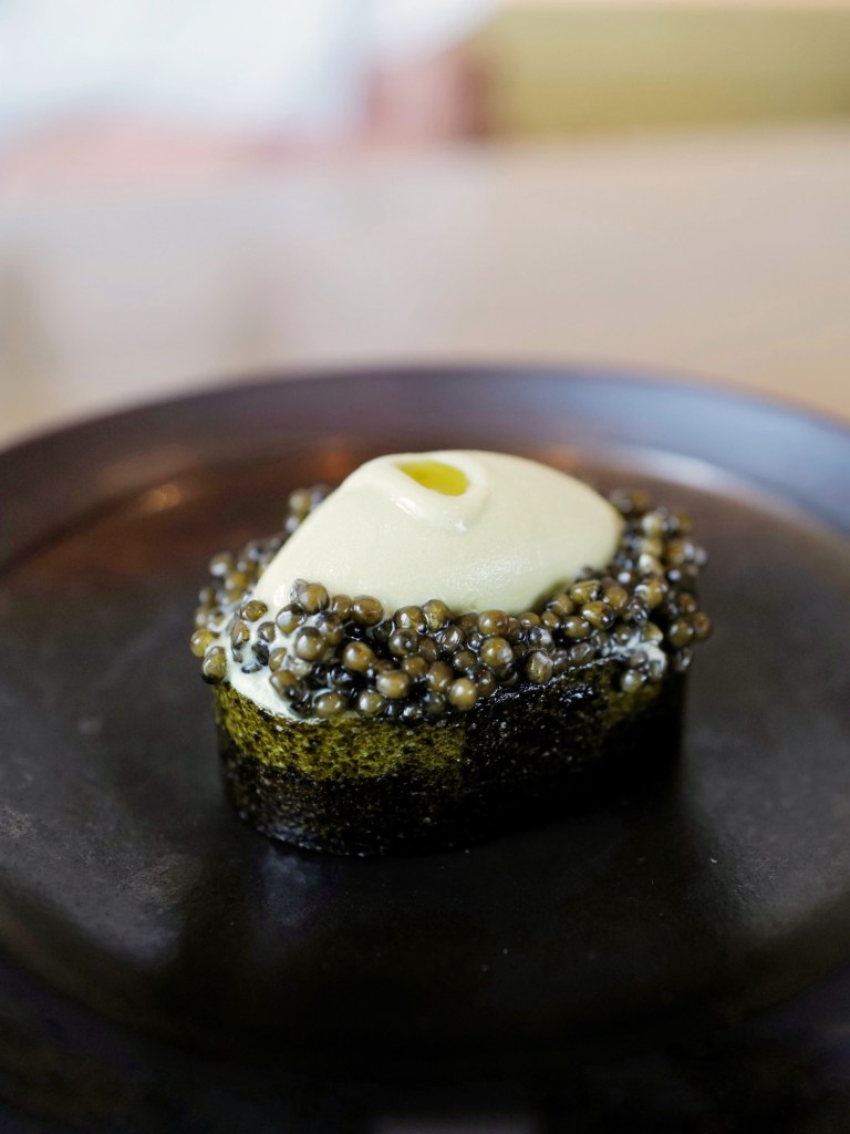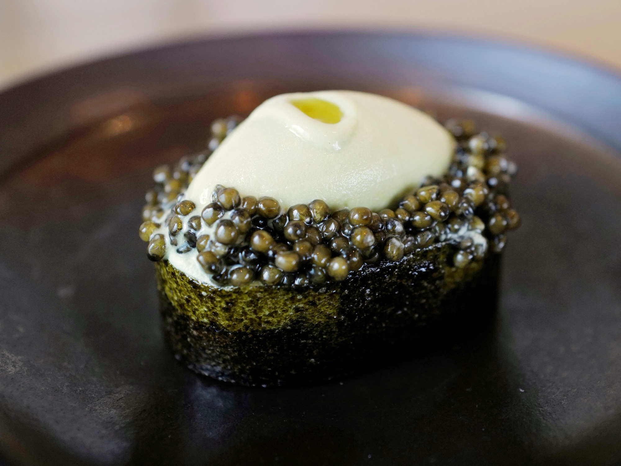 是以軍艦壽司為靈感的魚子醬抹茶塔