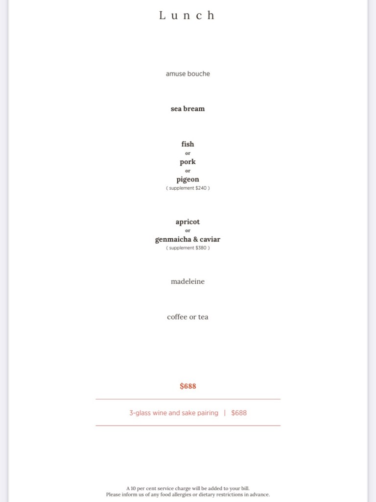 除了午間套餐原本就有的開胃菜、前菜、主菜、甜點外,另有四種料理可以加點;餐點使用大量處理得宜的海鮮及鮮味食材,清爽卻不失滋味