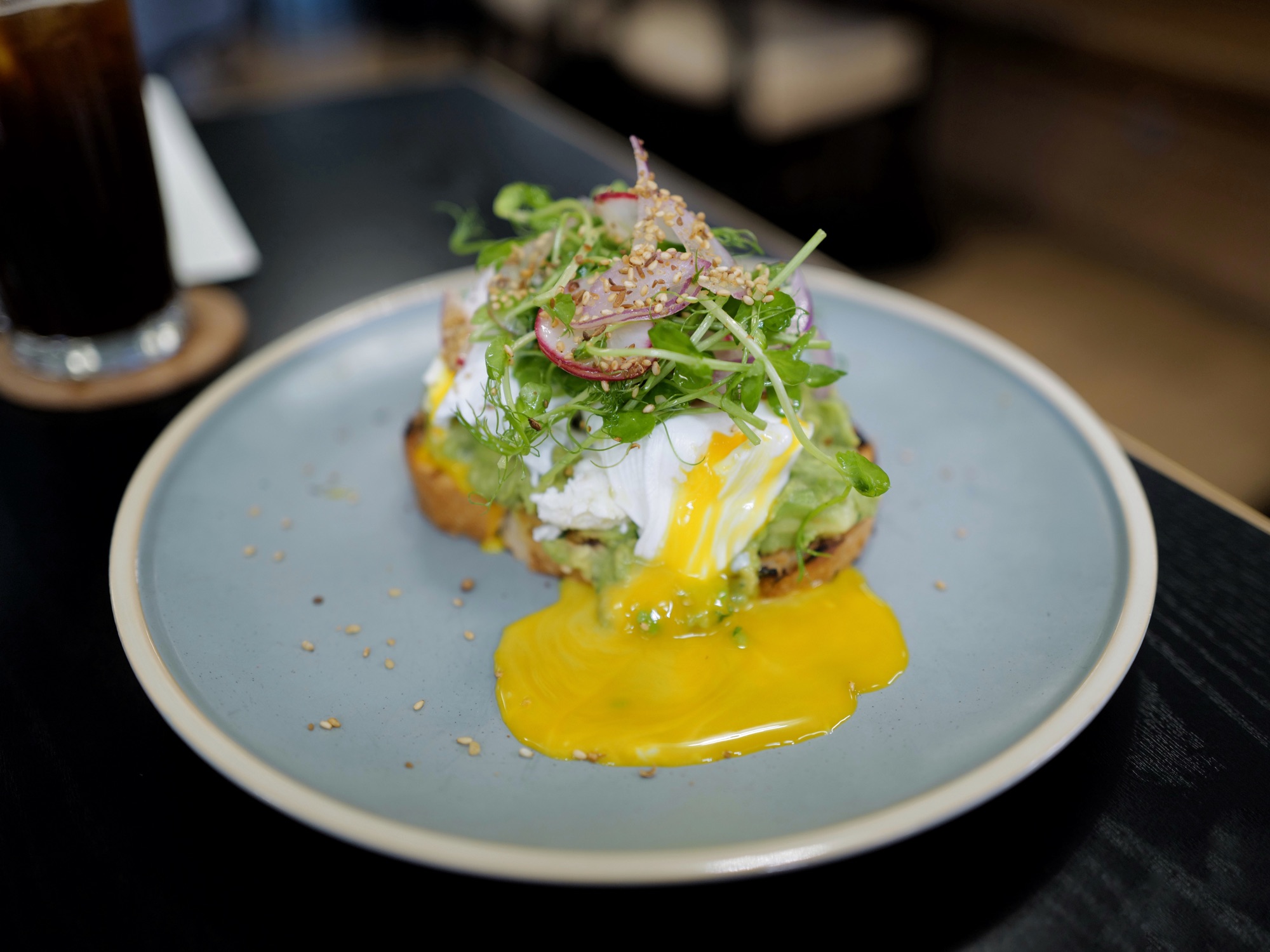 (avocado, poached eggs, dukkah, goats’ cheese, sourdough)