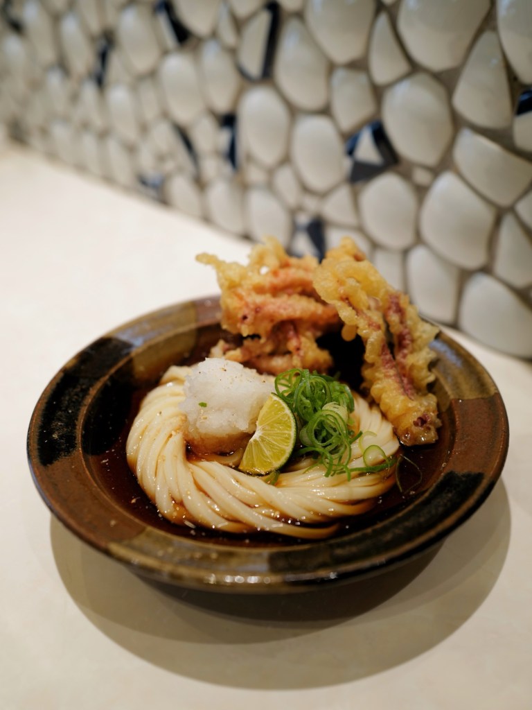 我點了最想吃吃看的carbonara,是熱烏龍麵加生蛋黃、parmigiano-reggiano乳酪絲、厚切培根和奶油塊,吃起來奶味比想像中淡一些,因此沒這麼厚重,值得一試但對我來說吃過就好;旅伴點的bukkake冷烏龍麵加炸花枝則意外耐吃,淡醬油、蘿蔔泥和金桔汁搭配彈牙麵條,是夏日裡願意每天吃的美味,份量較預期的小就是了