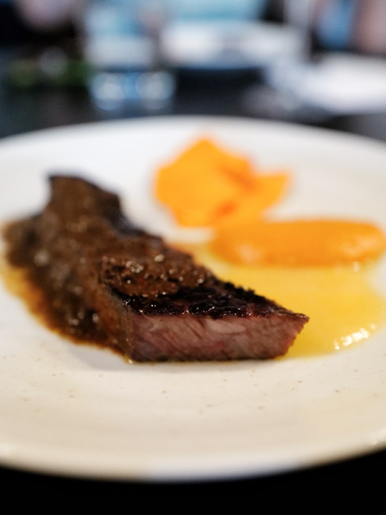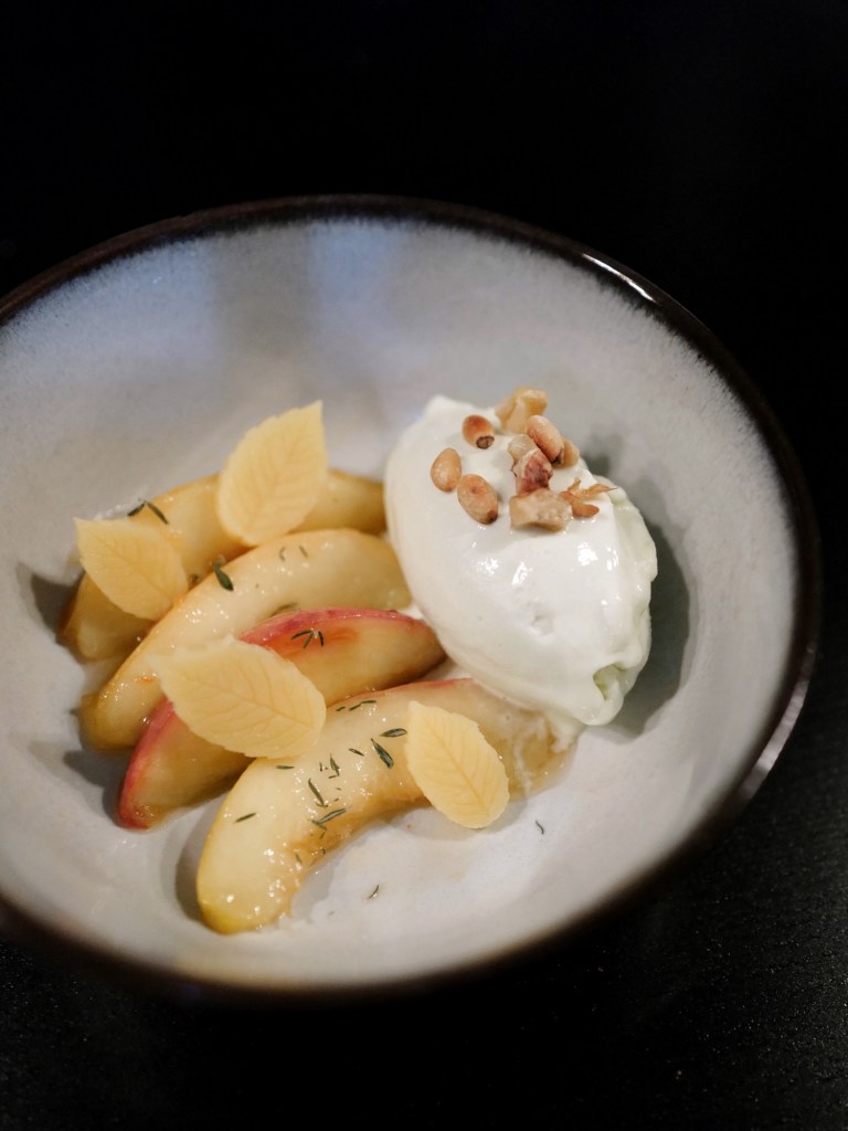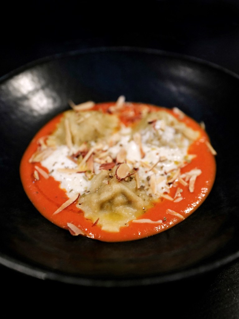 主廚Marta真的很會做菜,以義大利料理為基調,再融入各國風味點綴,調味大膽但每一道菜味道都非常好,這天吃到最最喜歡的是煎豬排搭配青醬、雞肉半月餃與雞鴨濃湯、牛小排佐BBQ醬和蔬果泥,還有甜點的斑斕葉冰淇淋