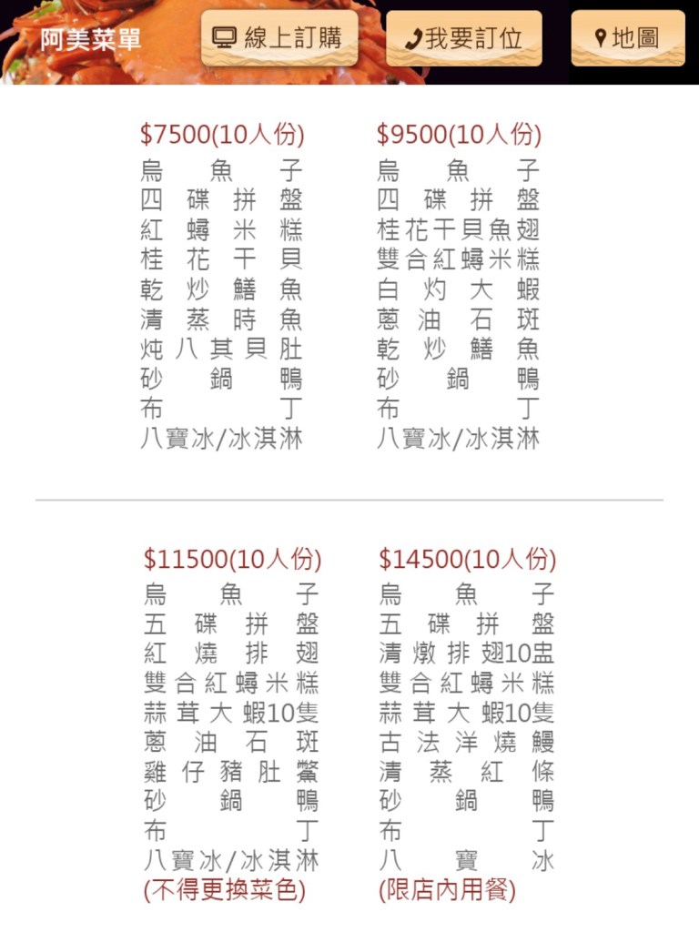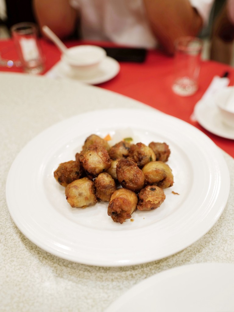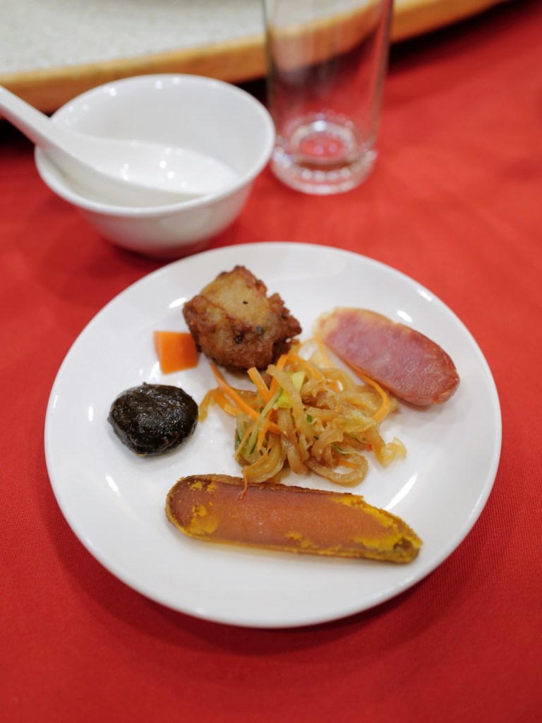 這次選了十人宴席菜單(有更換菜色),有許多古早味的菜餚,當中自己比較喜歡的是香嫩的香油豬肝、帶蒜香的古法燒洋鰻,及單純美味的清蒸紅條,其餘相比之前來訪時好像更粗糙一些,不知道是不是這天的特殊狀況?