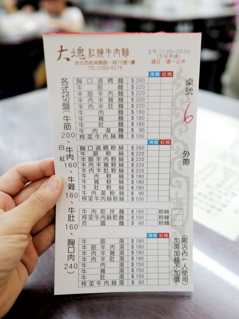 自從發現雙北地區最蓬勃發展的台灣小吃可能是牛肉麵以後,日常覓食就很常往牛肉麵店去,這天嘗試的是杭州南路上的老字號大塊牛肉麵
