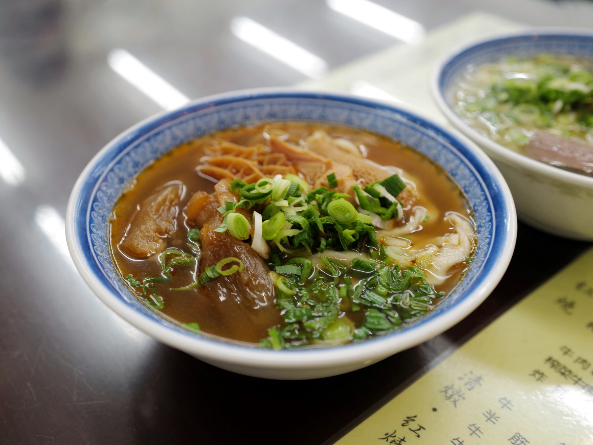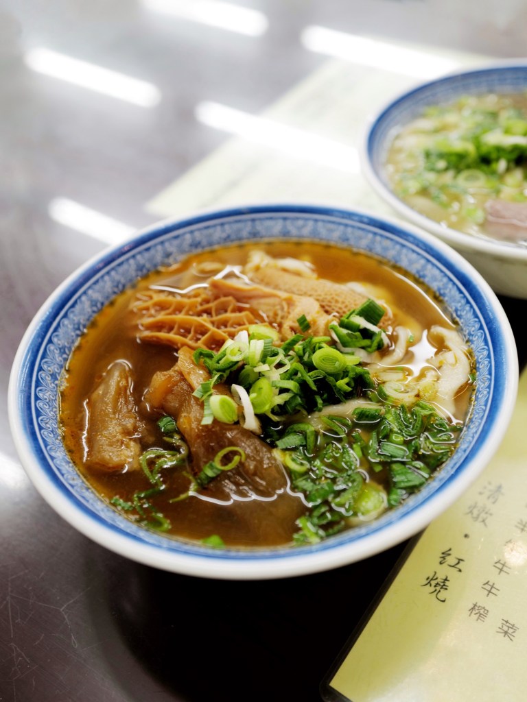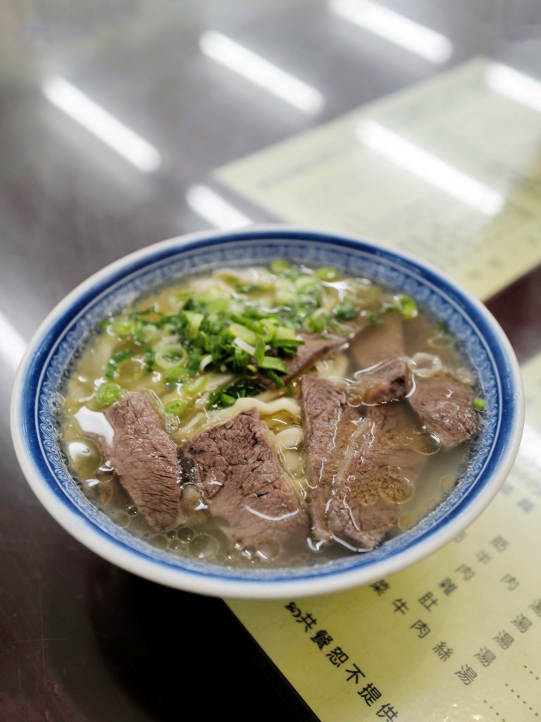 主打使用台灣牛以中藥燉煮,兩個人紅燒、清燉各點了一碗,兩種湯頭都偏清淡,鹹度低;牛肉確實有台灣牛肉淡雅的肉香,我喜歡他們手擀刀削麵不規則的口感和大量蒜苗
