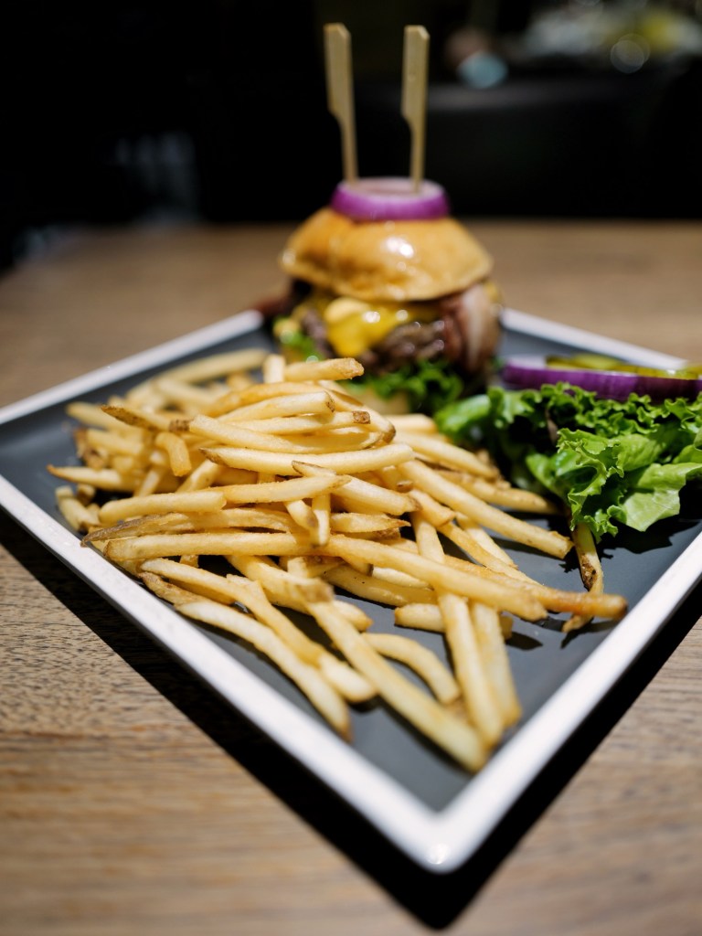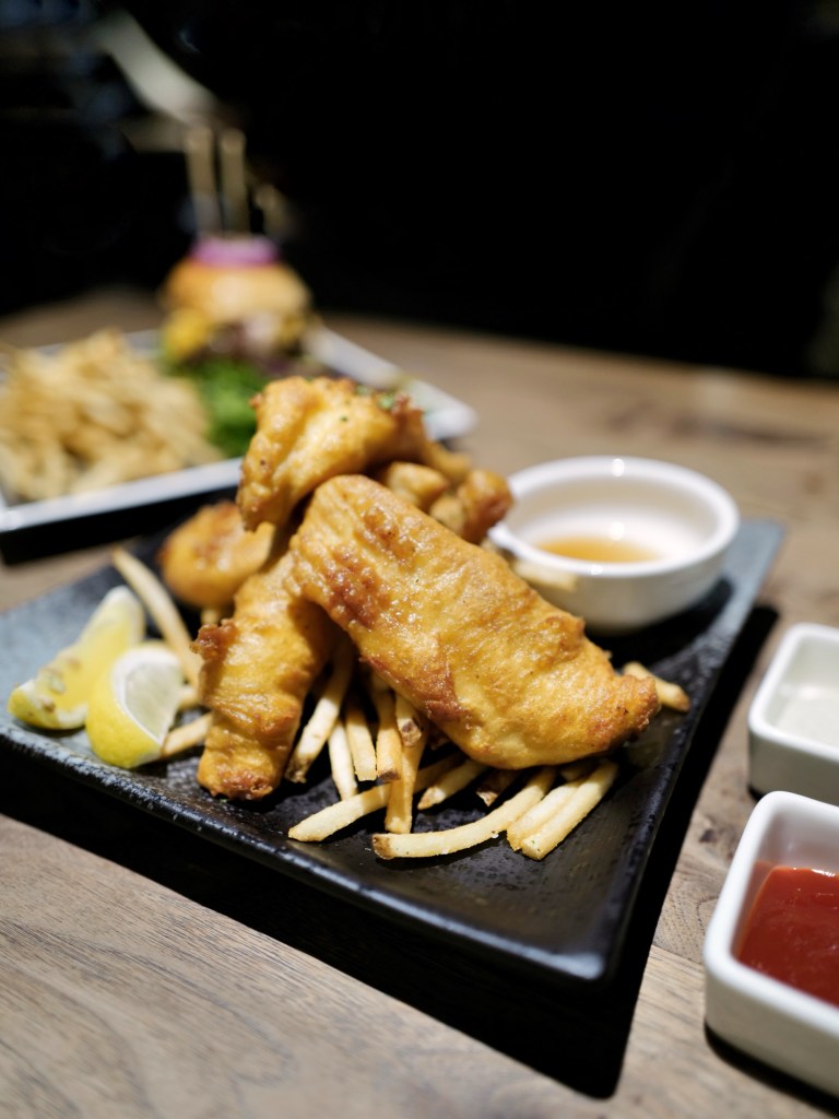兩個人點了一份漢堡(含配菜)、一份炸魚薯條和最想吃的巨無霸巧克力蛋糕,終於吃到甜滋滋的美式巧克力蛋糕超級心滿意足!也喜歡他們的細薯,咬感好、粗鹽調味更提升香氣