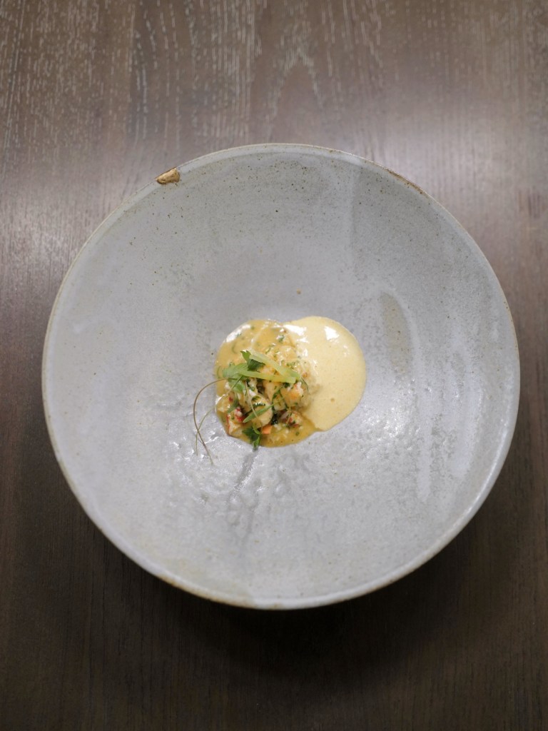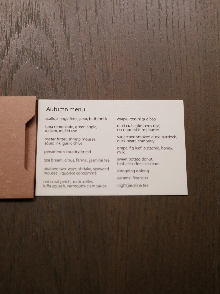 這次吃秋季菜單,菜色和餐具使用讓人感覺像帶日式風格的法國料理,當中有七道使用海鮮、兩道是紅肉,整套吃下來不會膩口,食材烹調和搭配也有一定水準