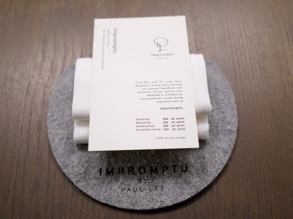 隨口說到還沒吃過小有名氣的Impromptu by Paul Lee,朋友立刻線上訂了位,年末依舊很有口福!看空位狀況似乎比前幾年好訂許多(點我看米其林指南怎麼說)