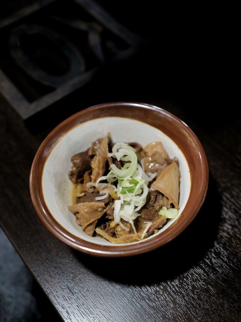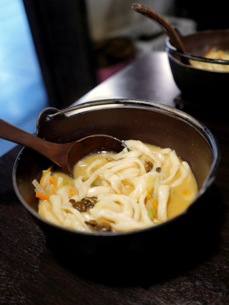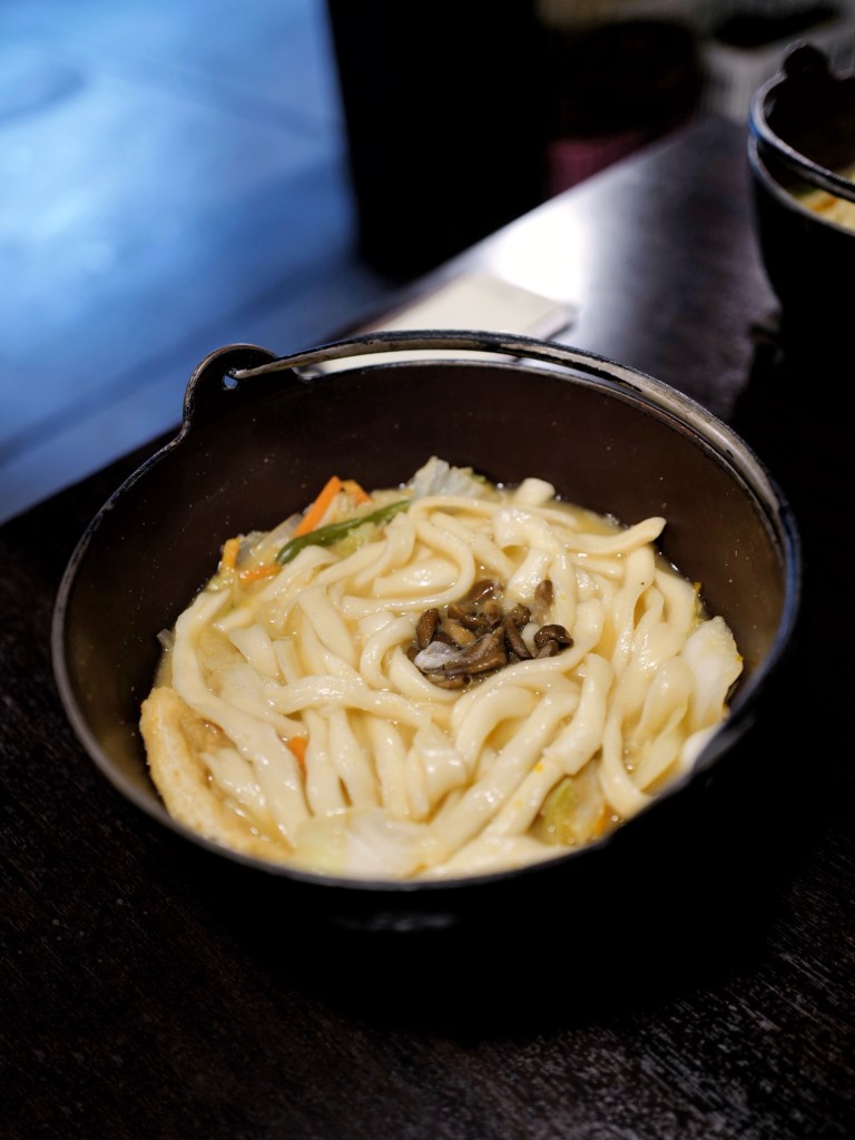 我們三個人點了兩碗餺飥和一份牛內臟煮,餺飥是固定大小、份量滿多,湯裡加入味噌和南瓜等蔬菜,搭配Q彈的麵體,吃起來滿暖心的~內臟煮的味道類似醬油滷物,對台灣人說也許不這麼稀奇