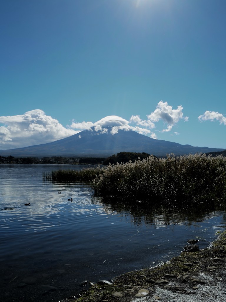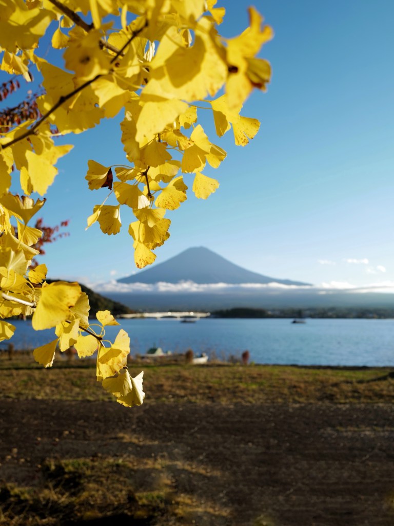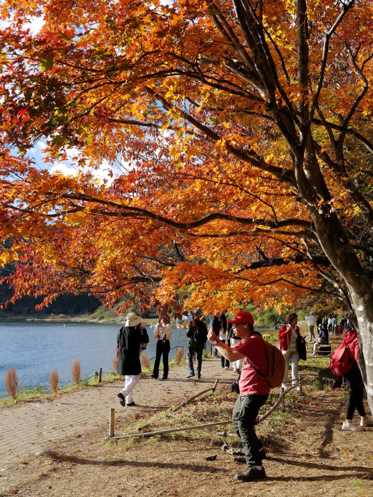 延著河口湖走,隨便找到這個有咖啡廳(a.k.a.廁所)的地區,有楓樹、可以近距離接觸河口湖岸;從這裡散步回河口湖大橋的湖邊小徑遊客不多,邊閒逛邊賞風景特別舒服