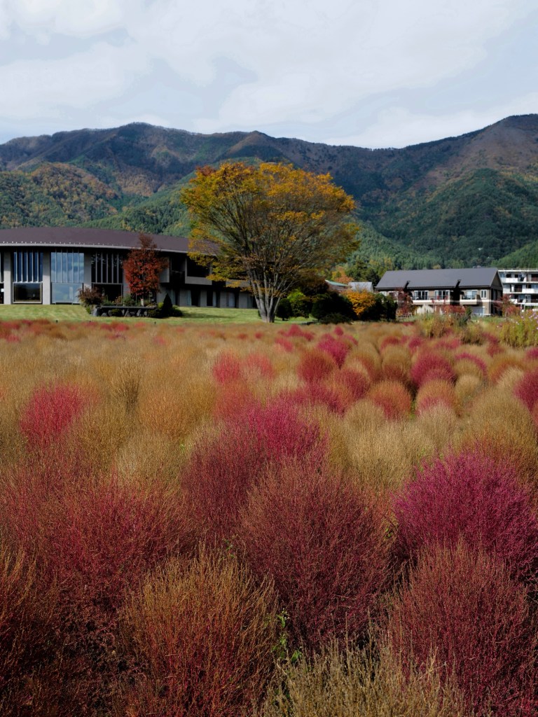 有各式各樣的四季花卉,11月初到訪時,最可愛的就是富士山景前的粉紅色波波草叢!