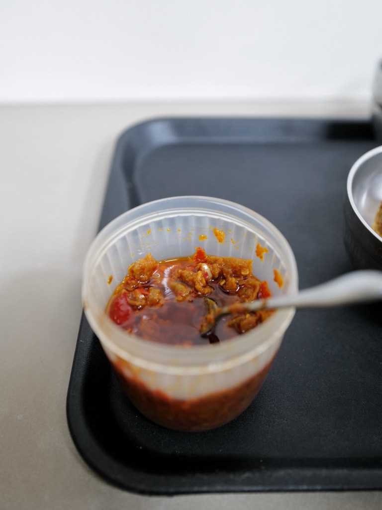 兩個人點了肥、瘦米糕各一個與綜合丸湯,瘦肉米糕上頭放的是瘦豬肉和一小瓣滷蛋,肥肉則是單純的肥豬肉,可以加甜辣醬、香氣十足的特製蘿蔔辣椒醬入口,我覺得整體味道ok但吃起來稍油,建議自備冰飲料