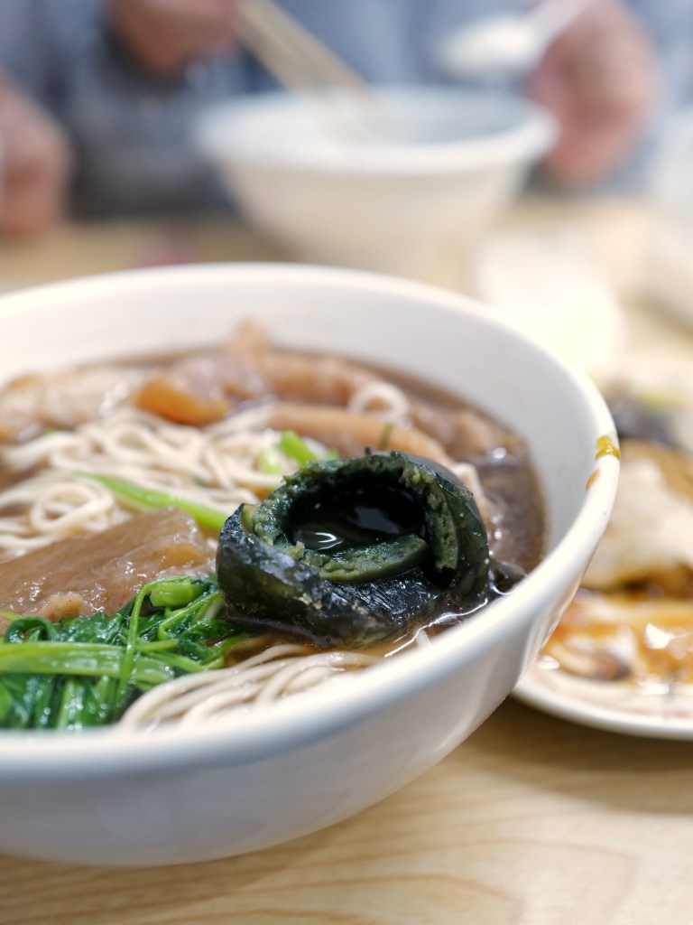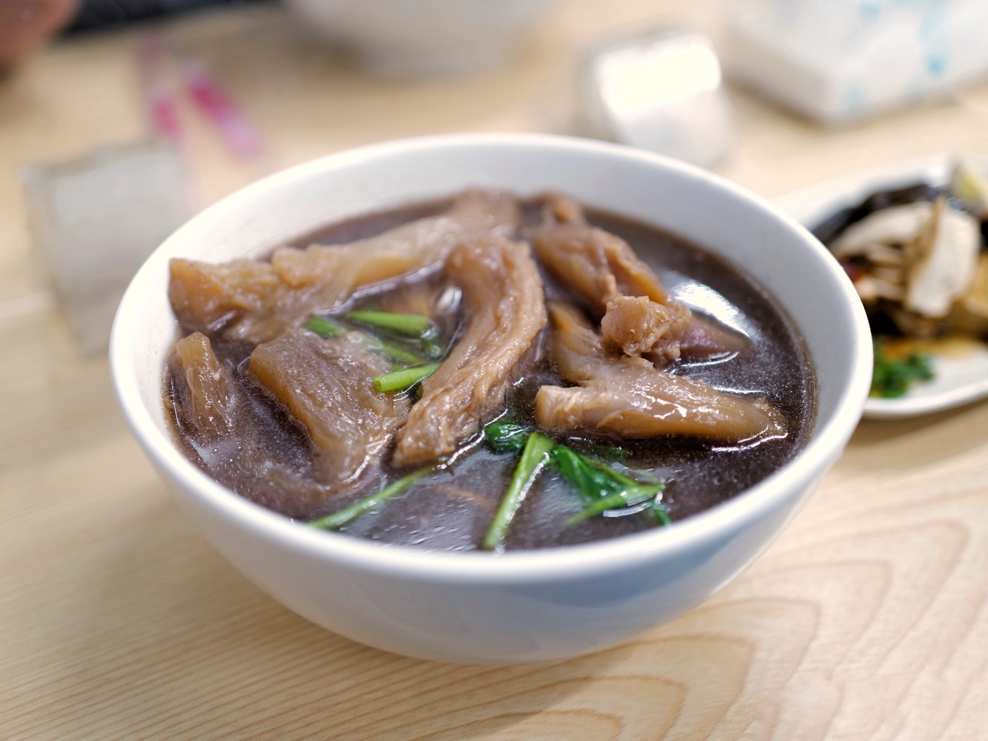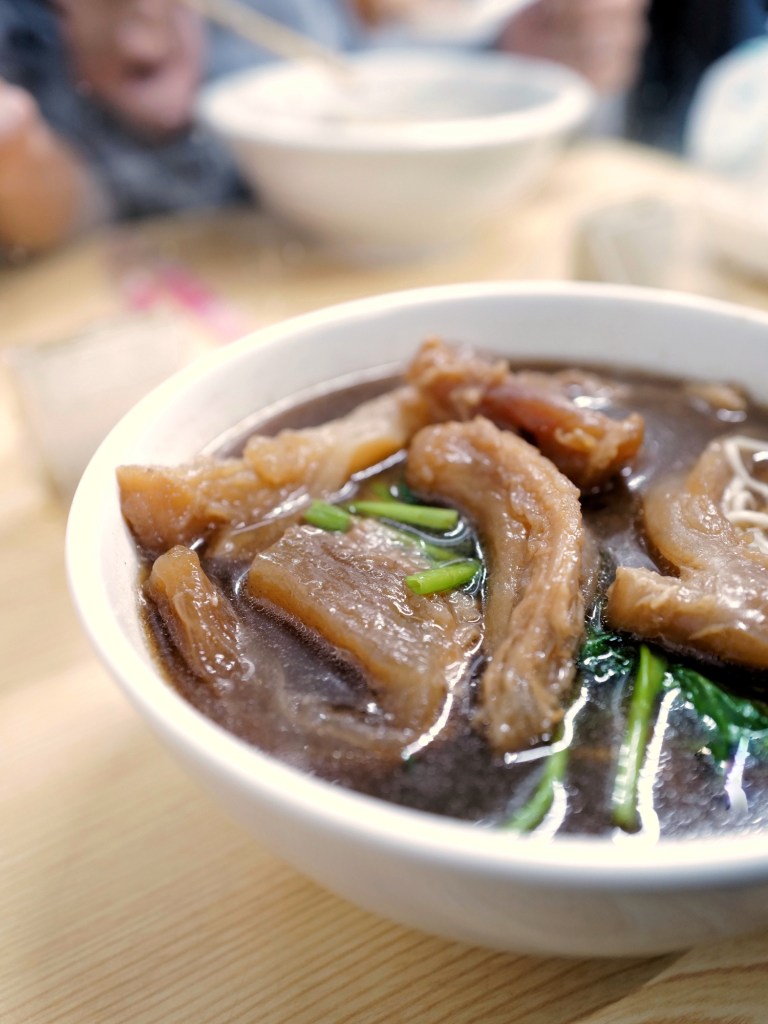 原本想吃半筋半肉麵,不小心點成牛筋麵,於是又加了一碗牛肉湯,牛肉和牛筋切得超大塊!肉量算多,並非超級軟嫩的類型,牛肉微卡牙縫;紅燒湯頭鹹淡適中,是我心目中滿經典台灣牛肉麵的味道