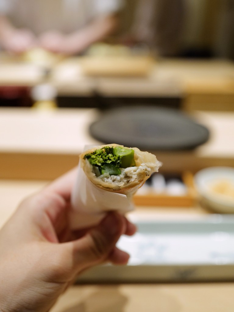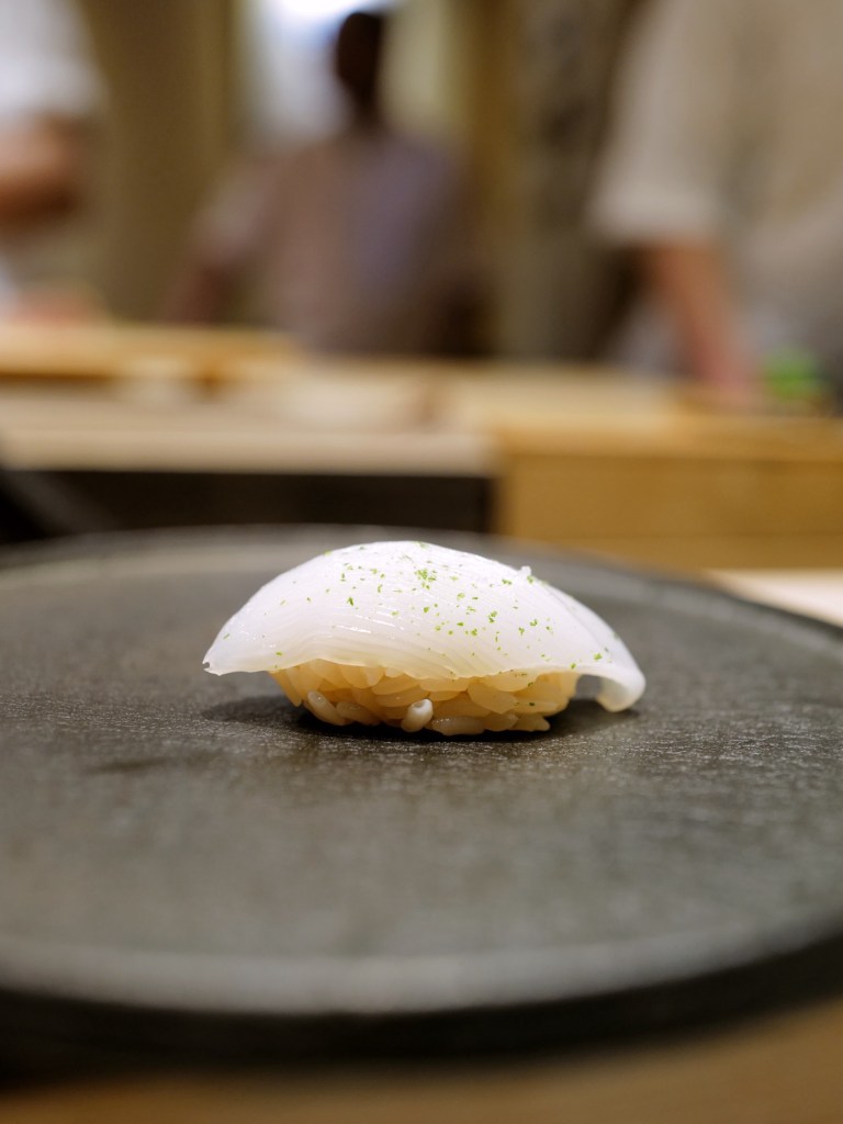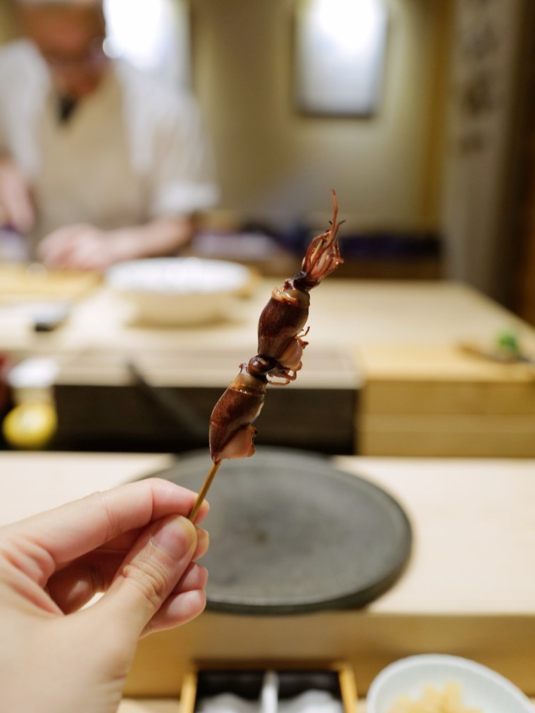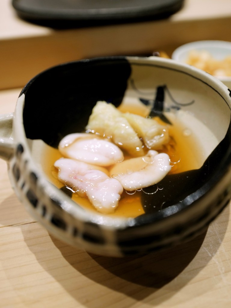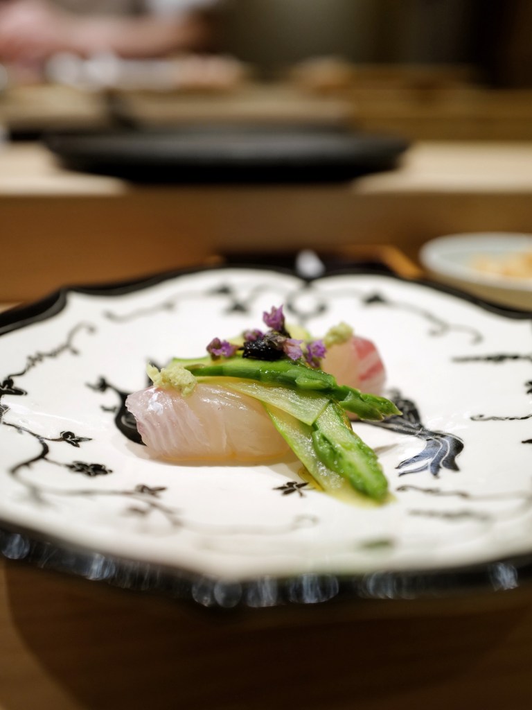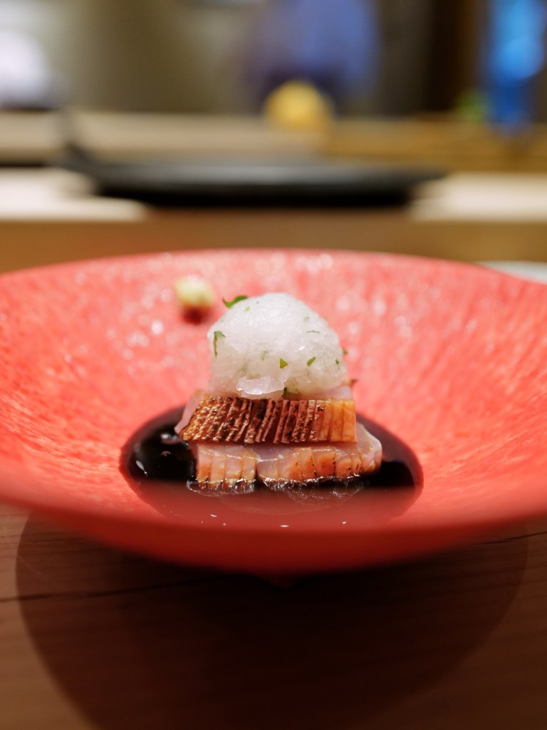 春季菜單每道都好吃不說,這日的亮點是超級鮮的夢幻葡萄蝦、完美搭配醋凍的喜知次魚肝、熟度恰好的真鯛白子,與細緻的目光魚一夜干