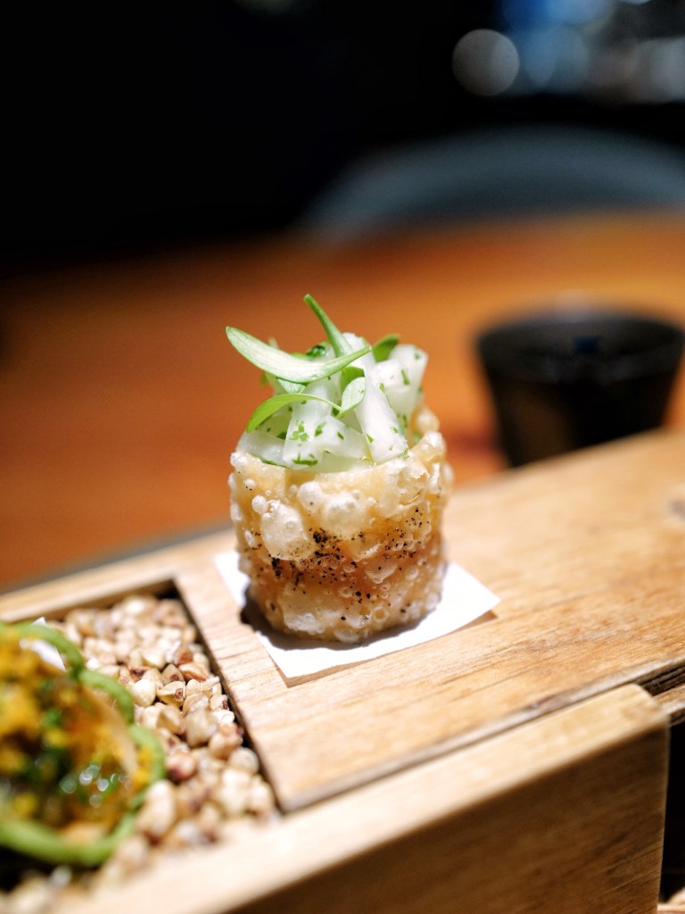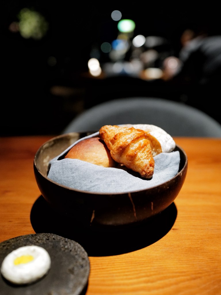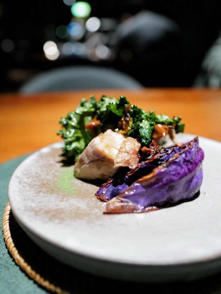 店內燈光配置集中,放置菜品的桌子正上方明亮、其餘則較暗,頗有氣氛
