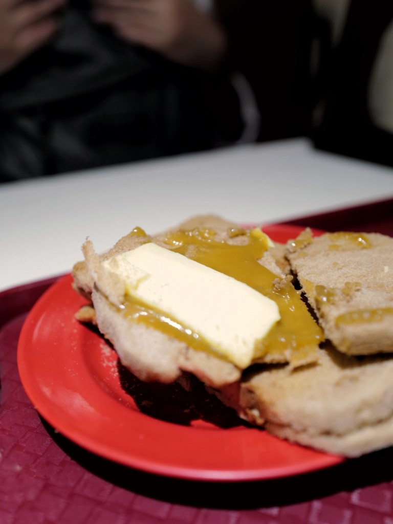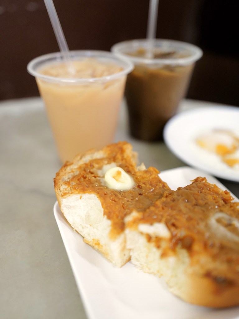 就近在住處旁邊的分店吃,選咖椰牛油吐司+雞蛋+淡奶奶茶的套餐,薄吐司乾、鬆、脆,凸顯中心咖椰醬、牛油塊的甜度和風味;奶茶較喜園的茶味重一些,可能因為選淡奶的關係,也讓人聯想到港式奶茶