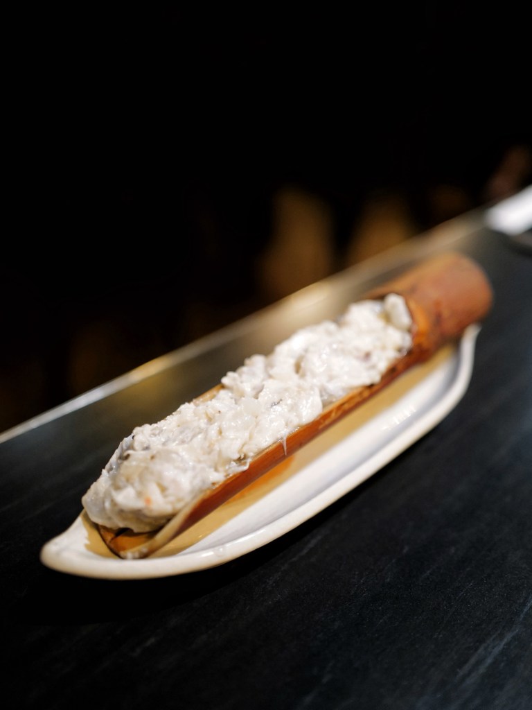 Mix garlic chives, white vinegar, and sesame oil according to the ratio suggested on the menu for a balanced sauce.
