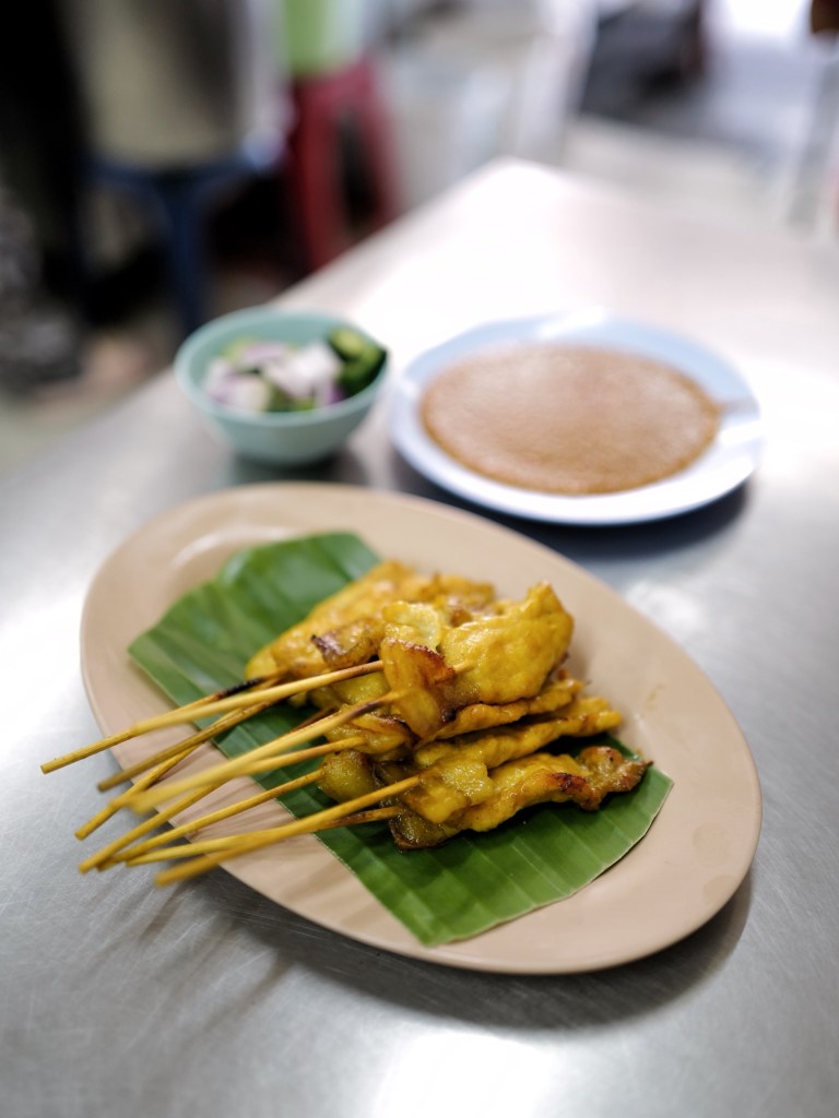 店內主要供應牛雜湯、牛肉鍋,我們兩個人共吃一鍋,牛雜、牛肉、牛丸等配料口感都不錯,鍋底像是帶甜的清爽醬油湯頭,雖然是大熱天但吃起來沒什麼負擔;另外可以向店家點巷口攤車賣的豬肉沙嗲串,等牛肉鍋上桌的時候當餐前小點,莫名療癒