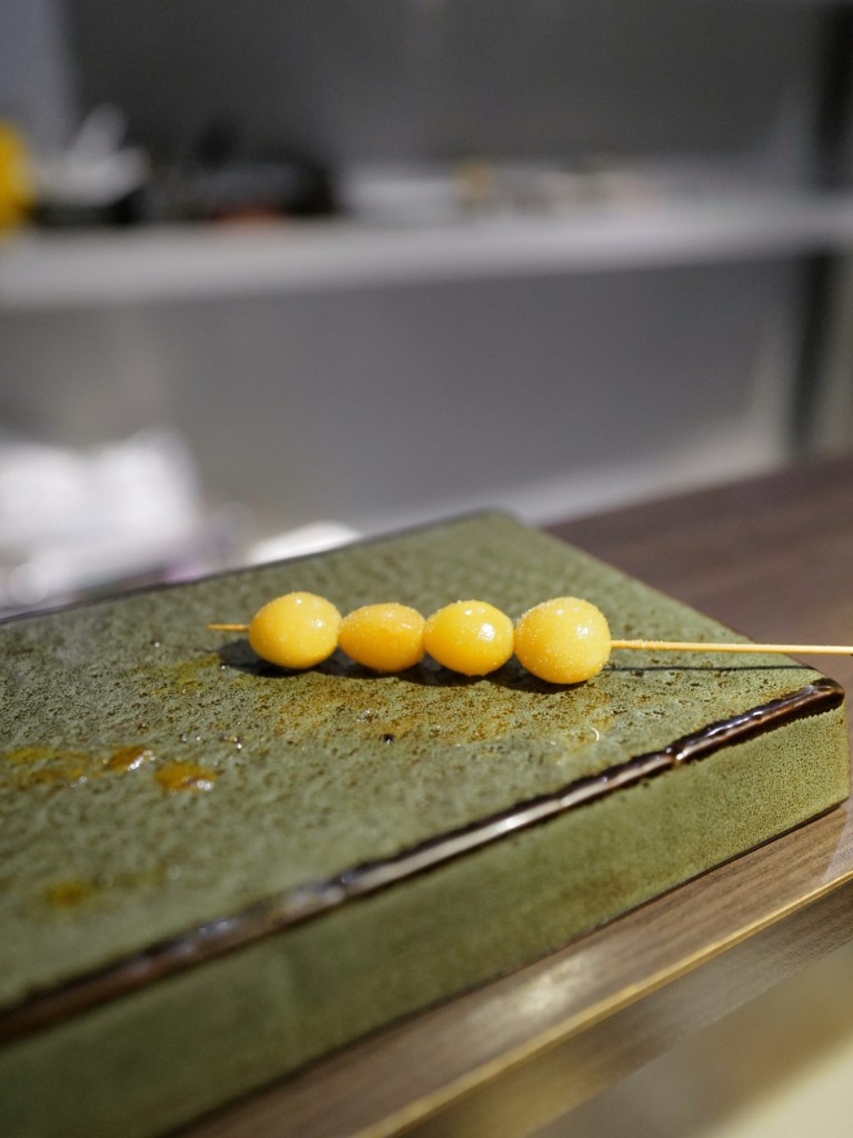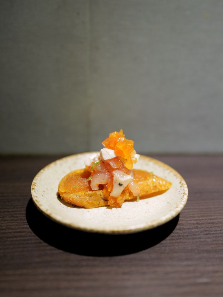 Served with lightly seared raw chicken, persimmon, and lemon zest. The mullet roe is outstanding on its own, and the accompaniments truly elevate it.