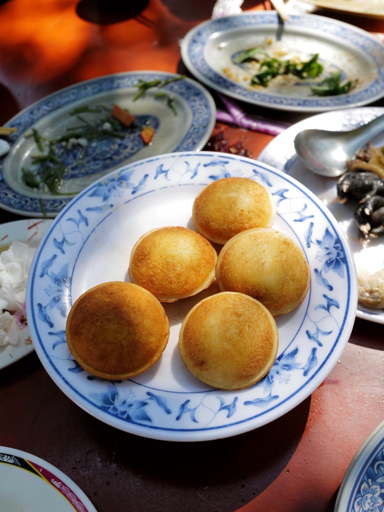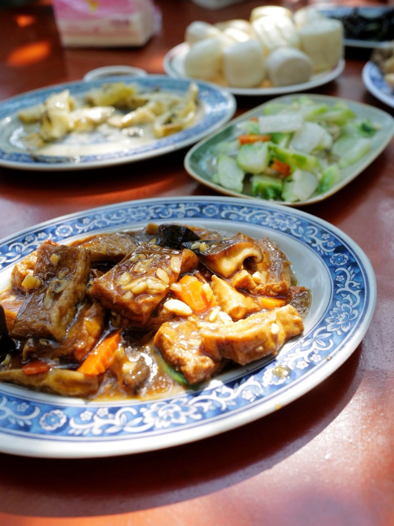 The freshly poached white-cut chicken was savory and flavorful. The vegetables were especially fragrant, possibly stir-fried with chicken fat. Seafood dishes such as three-cup squid and steamed stream bass were also well prepared. Guests who spend over TWD 400 per person can enjoy unlimited refills of sweet potato soup and chicken-fat rice vermicelli soup with taro. Both were delicious, especially the vermicelli soup, which was so aromatic that I kept going back it.