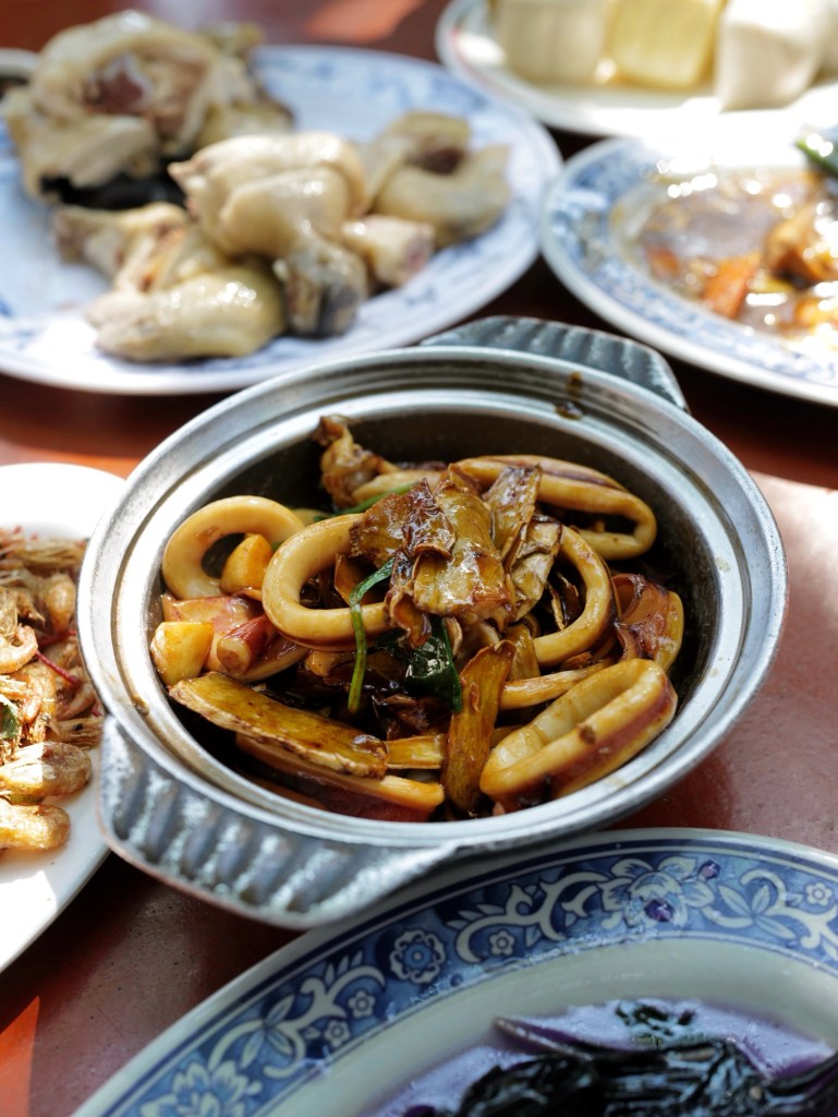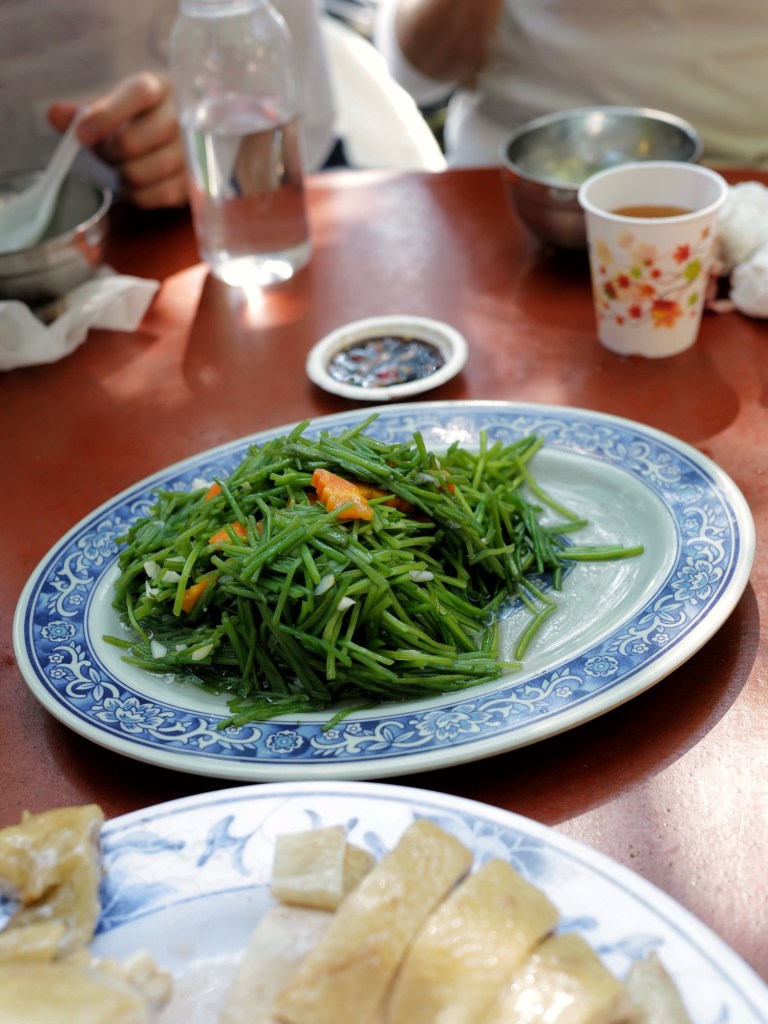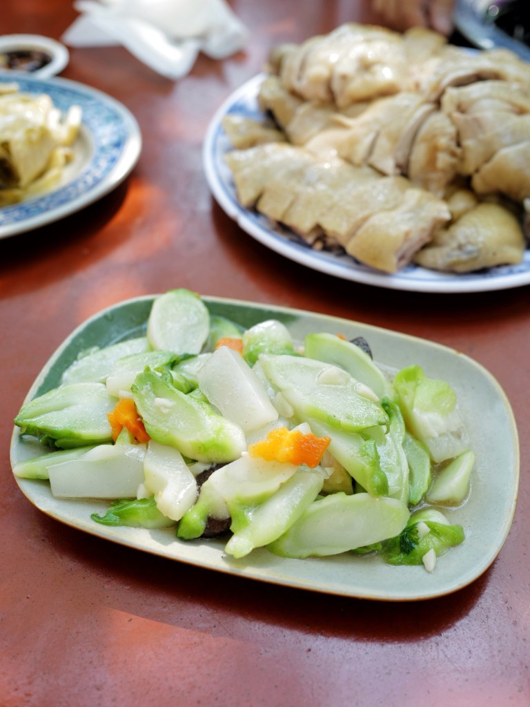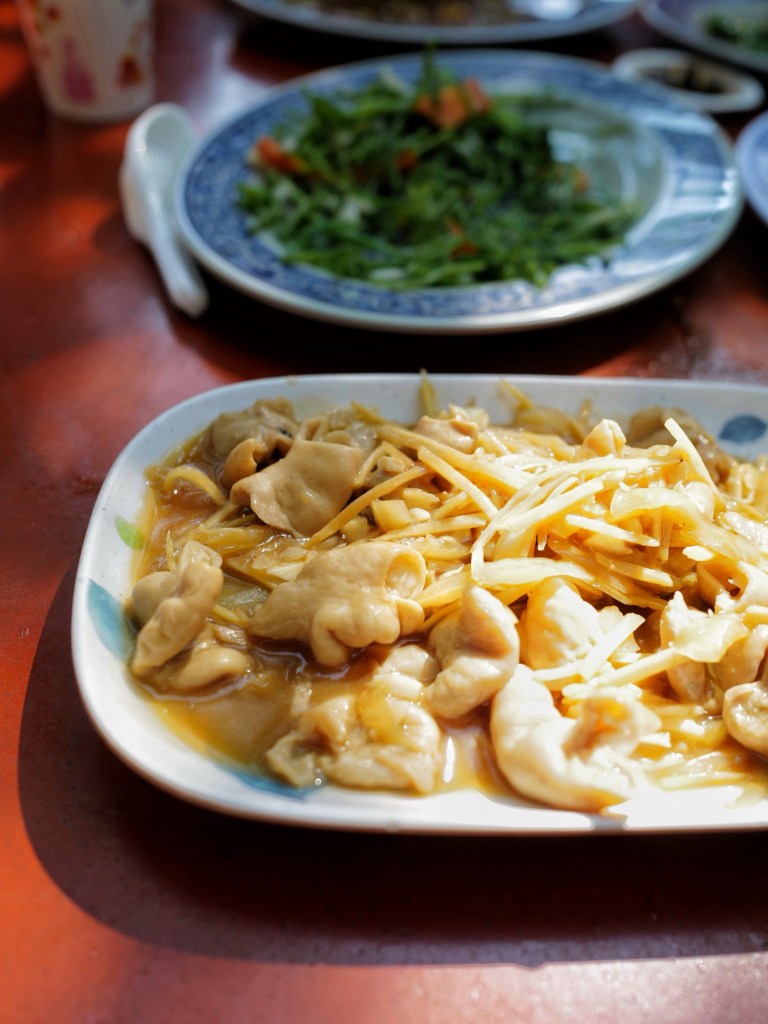 當天現燙的白斬雞鹹香味美,蔬菜類可能用雞油炒所以特別香,海鮮如三杯中卷、清蒸溪鱸也處理得不錯;每人消費達400元以上可無限享用地瓜薑湯、雞油芋頭米粉湯,兩者味道都很好,尤其米粉湯香得讓人忍不住一碗接一碗的盛