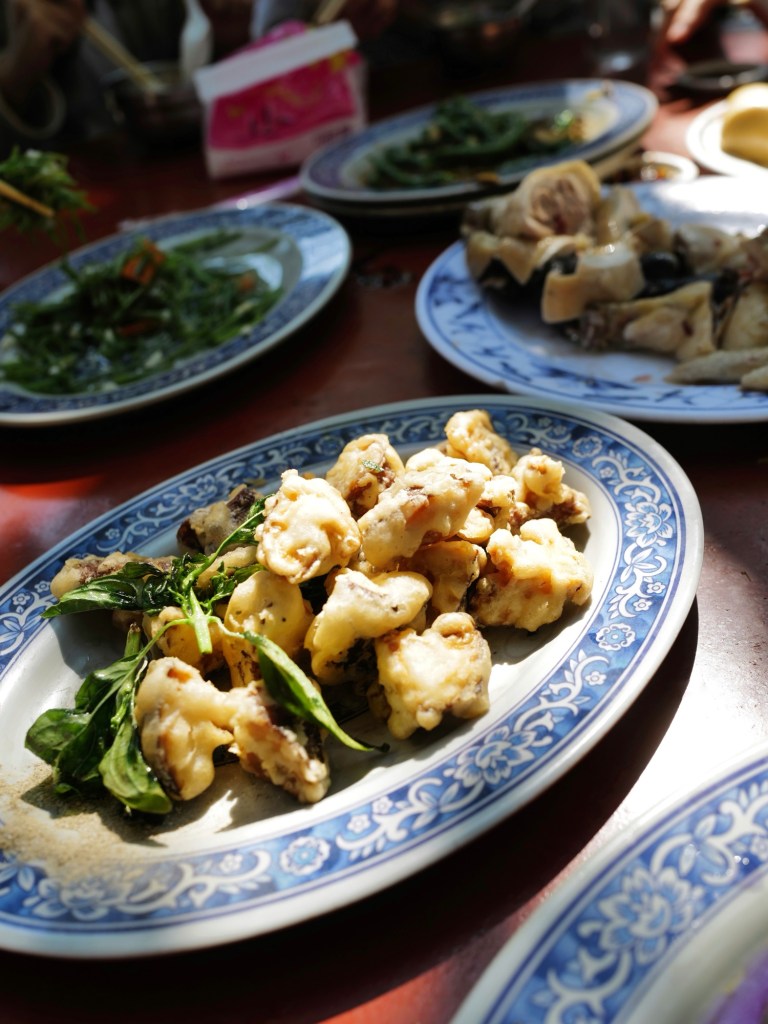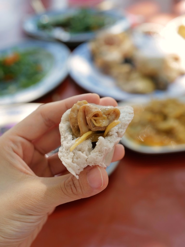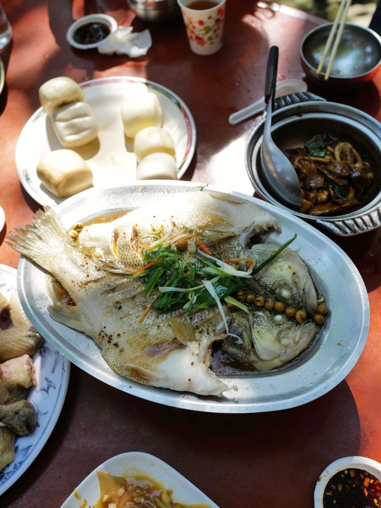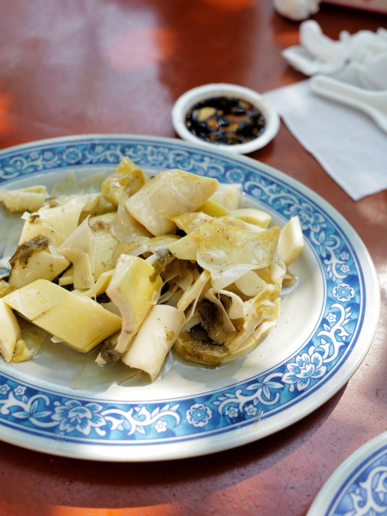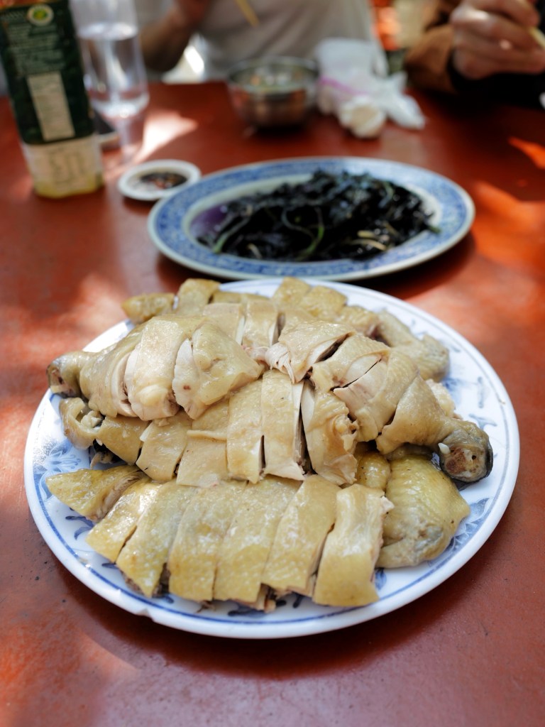 當天現燙的白斬雞鹹香味美,蔬菜類可能用雞油炒所以特別香,海鮮如三杯中卷、清蒸溪鱸也處理得不錯;每人消費達400元以上可無限享用地瓜薑湯、雞油芋頭米粉湯,兩者味道都很好,尤其米粉湯香得讓人忍不住一碗接一碗的盛