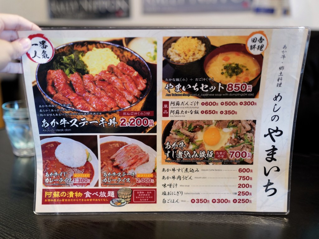 我們四人點了赤牛排丼、赤牛排咖喱飯各兩份:牛肉約三分熟,與名牌和牛相比,更瘦、風味更淡雅,柔軟不油;店家自製的醃漬物意外新鮮美味、種類繁多,搭配牛丼拌了大蒜醬油的白米飯,真的很療癒!不愧由專賣阿蘇高菜的漬物店「山一食品」所經營
