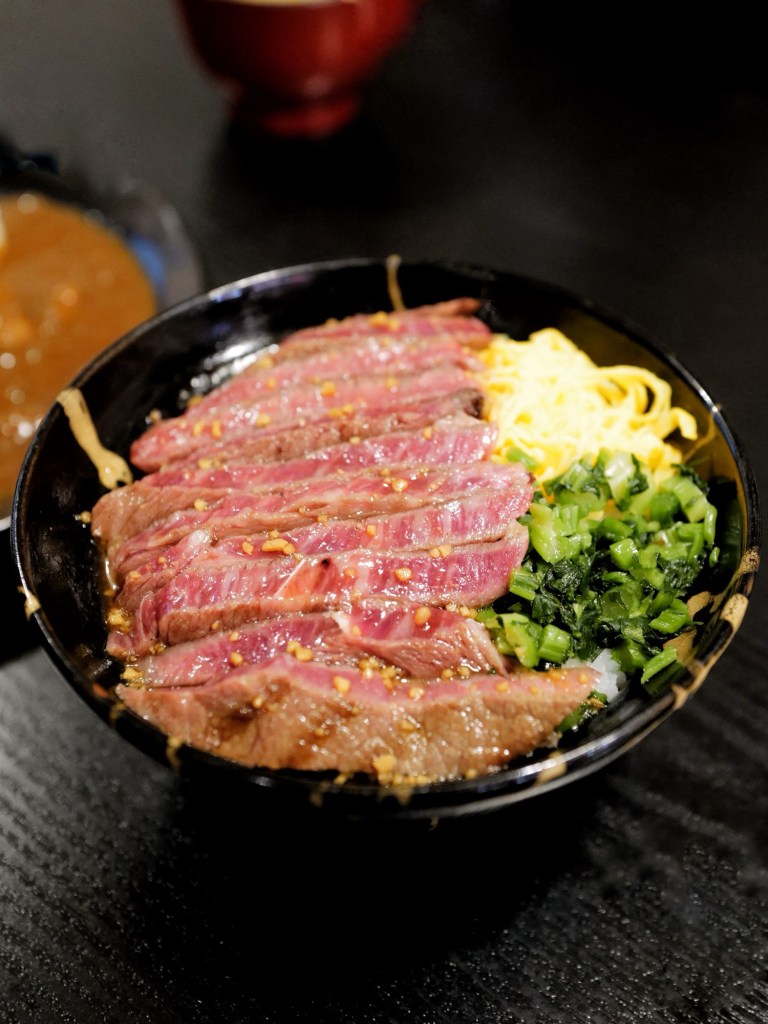 The four of us ordered two Akaushi steak rice bowls and two Akaushi steak curry rice. The beef was cooked to about medium-rare. Compared with premium wagyu, it was leaner, more delicate in flavor, and tender without being greasy. The house-made pickles in varieties were unexpectedly fresh and delicious, especially comforting to pair with white rice mixed with garlic soy sauce from the beef bowl. No surprise, since the restaurant is run by a pickle specialty shop known for Aso takana greens.
