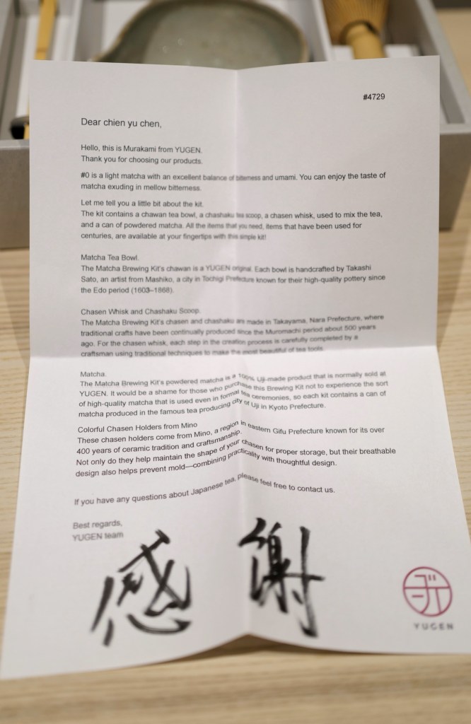 這次買的茶具組含片口抹茶碗、白竹茶筅、白竹茶勺,及 #1 50g 抹茶粉,另外單買一個茶筅座,包裝細緻不說,還附上打了名字的感謝信