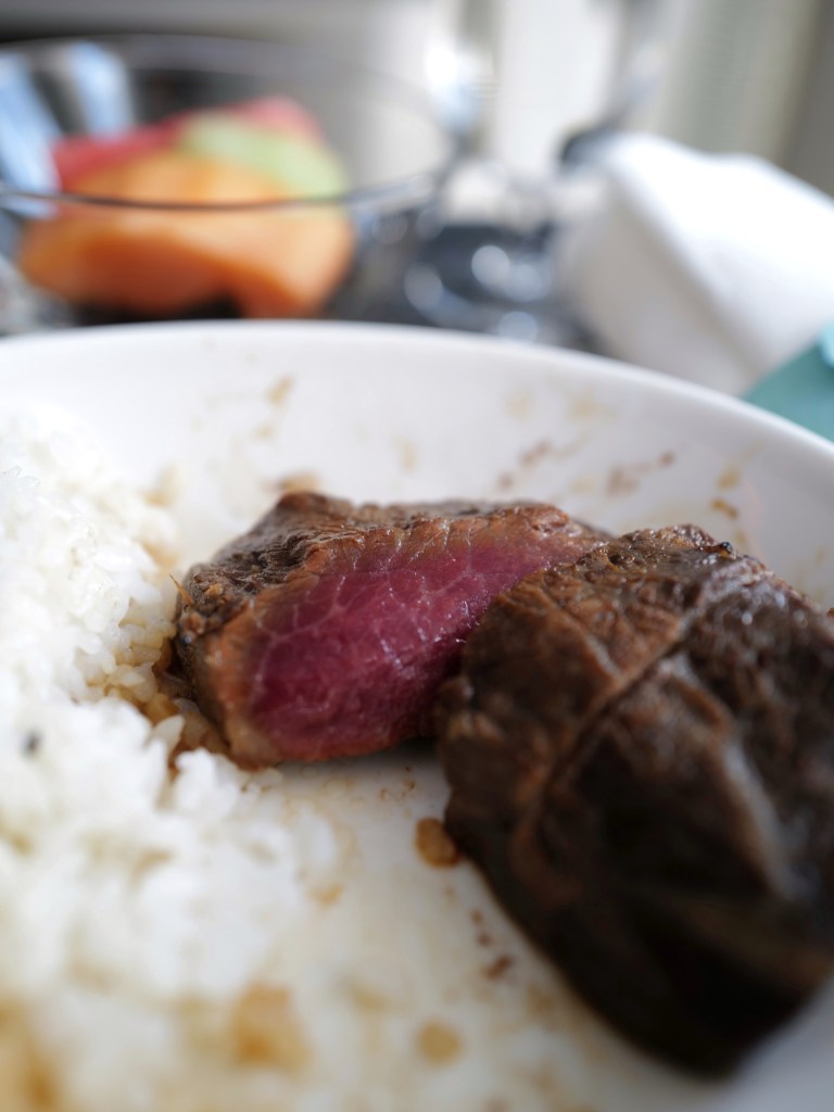選了菜單上方跟大腕燒肉合作的新品——牛小排佐芝麻米飯,牛排有一點點韌、看似三分熟,用帶甜味的醬汁醃過